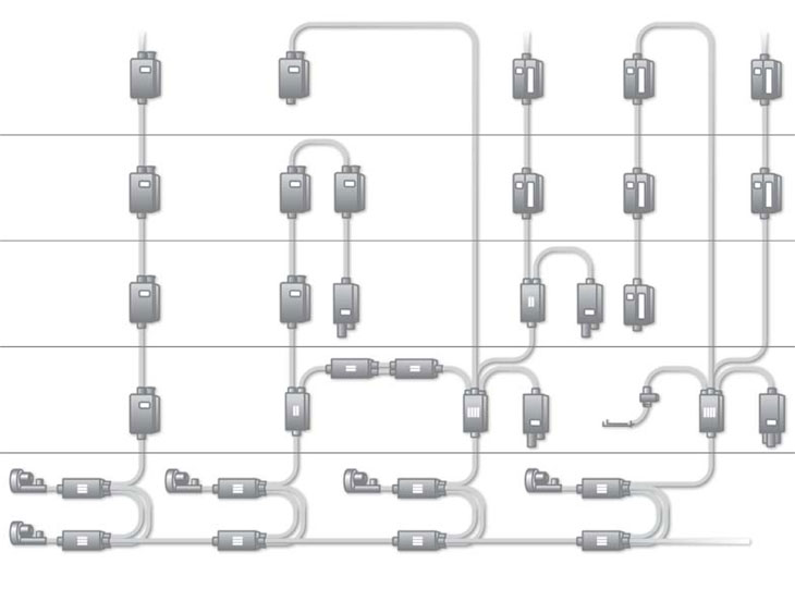 | A multi-zone system can be divided into various independent working zones. The AC3000 allows up to 64 zones. These zones are interconnected by a transfer system where the carriers are stored in waiting lines until their route is free to enter the next zone. Since each zone has an independent air supply, transmission in all zones can take place simultaneously and this can increase the performance of the system tremendously. In the configuration example below, up to 5 transmissions can occur simultaneously. | |